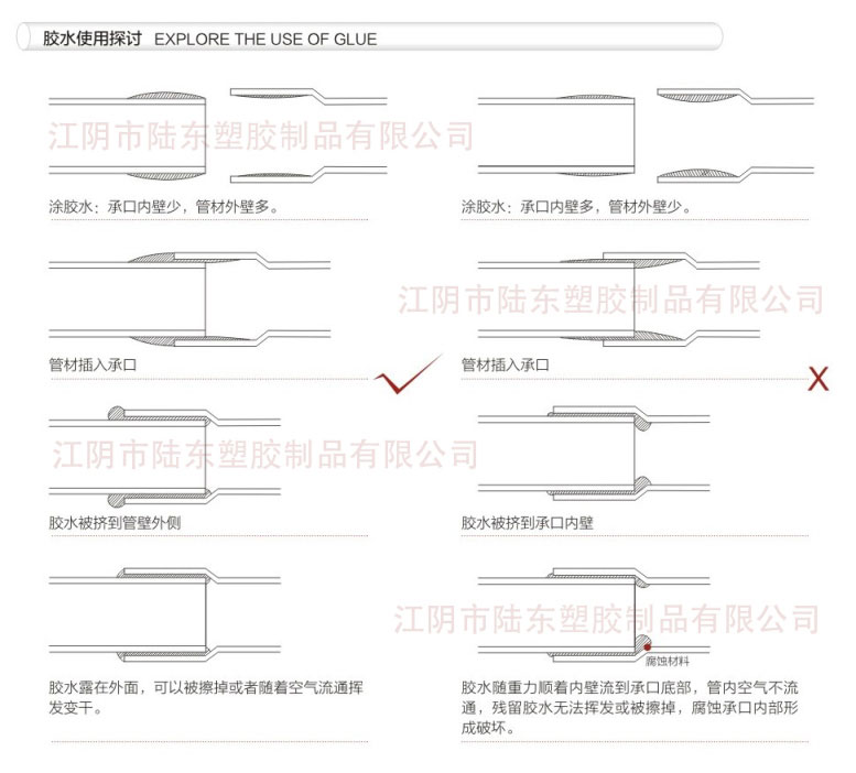當然,在本網(wǎng)站中,江陰市陸東塑膠制品有限公司已經(jīng)在之前的技術(shù)文獻里發(fā)表過圖示,正確涂抹膠水,安裝水管的對比圖,在這里,再次發(fā)布給做工程的同僚們看一下,加深印象,這樣在做PVC-U化工管件、UPVC工業(yè)管件這些對接操作的時候就不會有任何問題了。